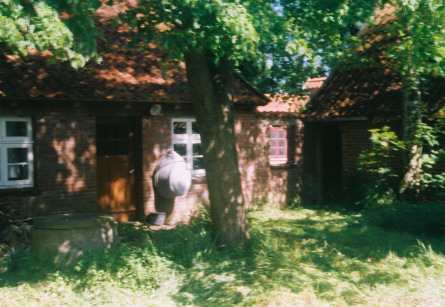 Herdfeuer, ein leerer Krug steht auf der Bank vor dem Hause... und an